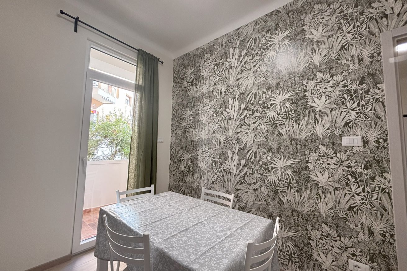 L’atmosfera si distingue per la combinazione di toni verde salvia e bianco, che si alternano con equilibrio su pavimenti in legno chiaro, creando ambienti rilassanti e legati alla natura. La cucina, dai toni scuri e finiture essenziali, offre un piacevole contrasto con il resto della casa, conferendo al locale un carattere contemporaneo e accogliente. Una parete decorata con motivi botanici aggiunge un elemento di originalità senza alterare la semplicità degli spazi.